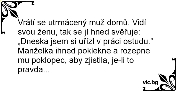 Vrátí se utrmácený muž domů. Vidí svou ženu, tak se jí hned svěřuje: „Dneska jsem si uřízl v práci ostudu.”