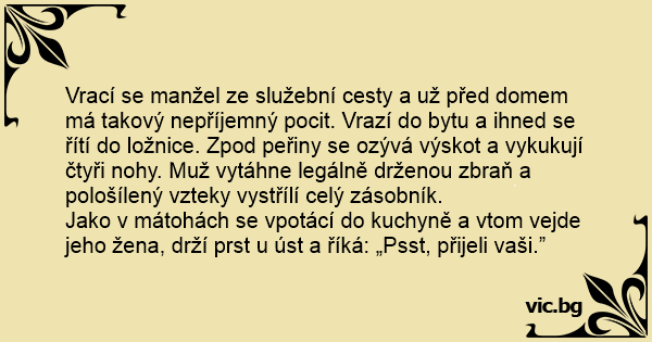Vrací se manžel ze služební cesty a už před domem má takový nepříjemný pocit. Vrazí do bytu a ihned se řítí do ložnice. Zpod peřiny se ozývá výskot a vykukují čtyři nohy. Muž vytáhne legálně drženou zbraň a pološílený vzteky vystřílí celý zásobník.