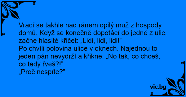 Vrací se takhle nаd ránem opilý muž z hospody domů. Když se konečně dopotácí do jedné z ulic, začne hlasitě křičet: „Lidi, lidi, lidi!”