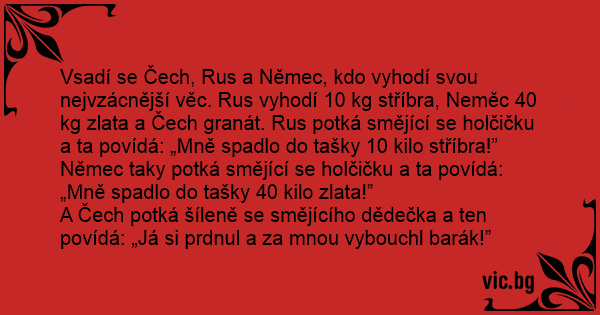 Vsadí se Čech, Rus a Němec, kdo vyhodí svou nejvzácnější věc. Rus vyhodí 10 kg stříbra, Neměc 40 kg zlata a Čech granát. Rus potká smějící se holčičku a ta povídá: „Mně spadlo do tašky 10 kilo stříbra!”