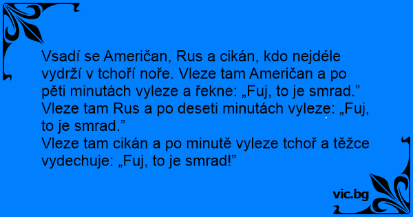 Vsadí se Američan, Rus a cikán, kdo nejdéle vydrží v tchoří noře. Vleze tam Američan a po pěti minutách vyleze a řekne: „Fuj, to je smrad.”