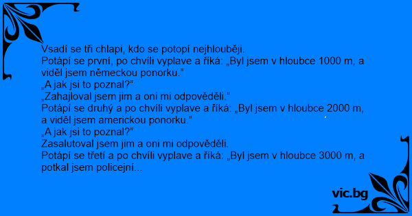 Potápí se třetí a po chvíli vyplave a říká: „Byl jsem v hloubce 3000 m, a potkal jsem policejní ponorku.”