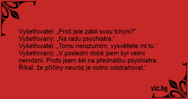 Vyšetřovaný: „V poslední době jsem byl velmi nervózní. Proto jsem šel na přednášku psychiatra. Říkal, že příčiny neuróz je nutno odstraňovat.”