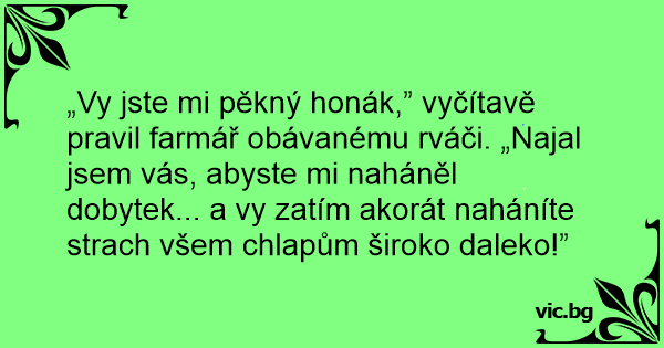 „Vy jste mi pěkný honák,” vyčítavě pravil farmář obávanému rváči. „Najal jsem vás, abyste mi naháněl dobytek... a vy zatím akorát naháníte strach všem chlapům široko daleko!”