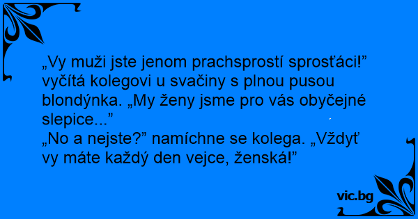 „No a nejste?” namíchne se kolega. „Vždyť vy máte každý den vejce, ženská!”