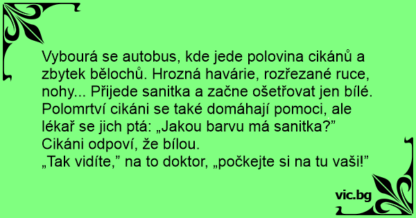 Vybourá se autobus, kde jede polovina cikánů a zbytek bělochů. Hrozná havárie, rozřezané ruce, nohy... Přijede sanitka a začne ošetřovat jen bílé. Polomrtví cikáni se také domáhají pomoci, ale lékař se jich ptá: „Jakou barvu má sanitka?”