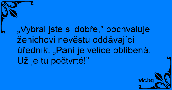 „Vybral jste si dobře,” pochvaluje ženichovi nevěstu oddávající úředník. „Paní je velice oblíbená. Už je tu počtvrté!”