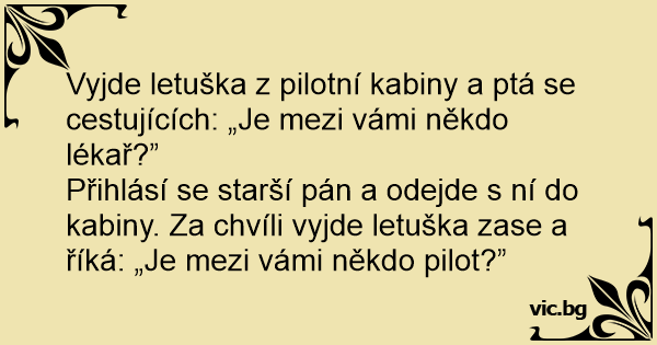 Přihlásí se starší pán a odejde s ní do kabiny. Za chvíli vyjde letuška zase a říká: „Je mezi vámi někdo pilot?”