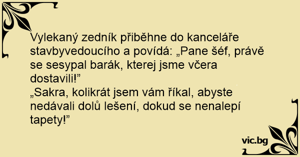 Vylekaný zedník přiběhne do kanceláře stavbyvedoucího a povídá: „Pane šéf, právě se sesypal barák, kterej jsme včera dostavili!”
