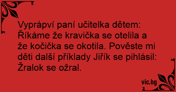 Vyprápví paní učitelka dětem: Říkáme že kravička se otelila a že kočička se okotila. Pověste mi děti další příklady Jiřík se pihlásil: Žralok se ožral.