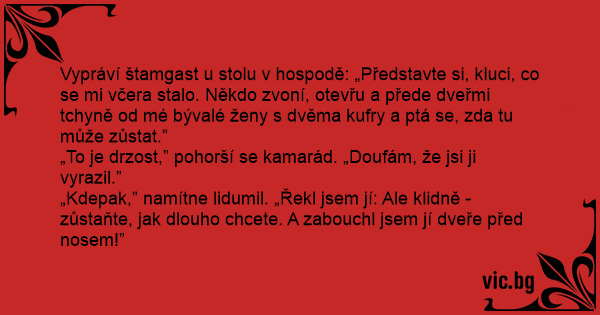 „Kdepak,” namítne lidumil. „Řekl jsem jí: Ale klidně - zůstaňte, jak dlouho chcete. A zabouchl jsem jí dveře před nosem!”