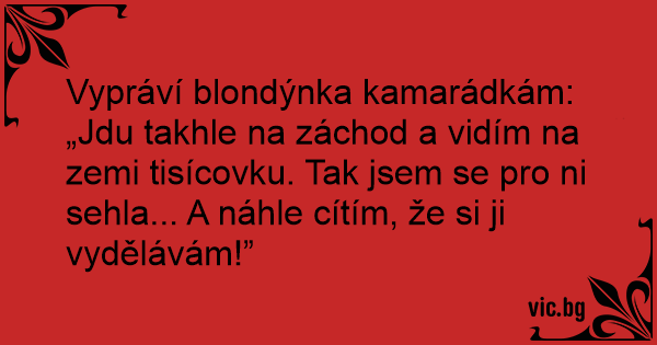 Vypráví blondýnka kamarádkám: „Jdu takhle na záchod a vidím na zemi tisícovku. Tak jsem se pro ni sehla... A náhle cítím, že si ji vydělávám!”