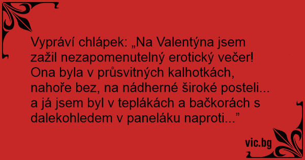 Vypráví chlápek: „Na Valentýna jsem zažil nezapomenutelný erotický večer! Ona byla v průsvitných kalhotkách, nahoře bez, na nádherné široké posteli... a já jsem byl v teplákách a bačkorách s dalekohledem v paneláku naproti...”