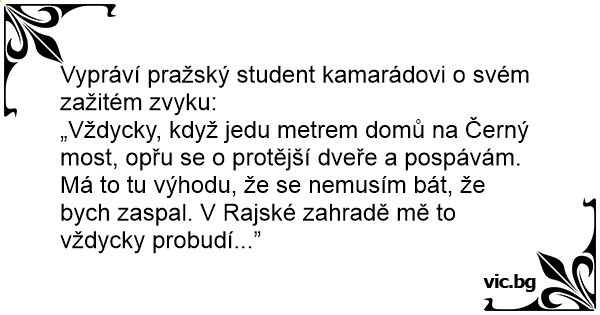 „Vždycky, když jedu metrem domů na Černý most, opřu se o protější dveře a pospávám. Má to tu výhodu, že se nemusím bát, že bych zaspal. V Rajské zahradě mě to vždycky probudí...”