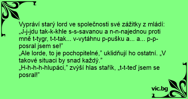 Vypráví starý lord ve společnosti své zážitky z mládí: „J-j-jdu tak-k-khle s-s-savanou a n-n-najednou proti mně t-tygr, t-t-tak... v-vytáhnu p-pušku a... a... p-p-posral jsem se!”