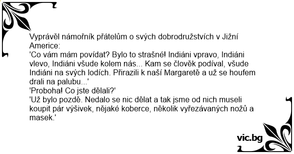 'Co vám mám povídat? Bylo to strašné! Indiáni vpravo, Indiáni vlevo, Indiáni všude kolem nás... Kam se člověk podíval, všude Indiáni na svých lodích. Přirazili k naší Margaretě a už se houfem drali na palubu...'