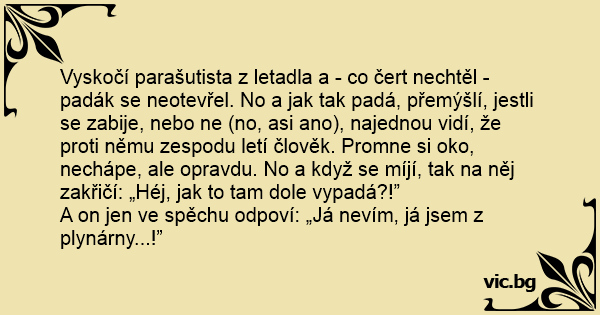 Vyskočí parašutista z letadla a - co čert nechtěl - padák se neotevřel. No a jak tak padá, přemýšlí, jestli se zabije, nebo ne (no, asi ano), najednou vidí, že proti němu zespodu letí člověk. Promne si oko, nechápe, ale opravdu. No a když se míjí, tak na něj zakřičí: „Héj, jak to tam dole vypadá?!”