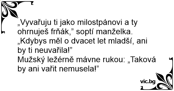 „Vyvařuju ti jako milostpánovi a ty ohrnuješ frňák,” soptí manželka. „Kdybys měl o dvacet let mladší, ani by ti neuvařila!”