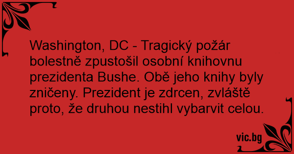 Washington, DC - Tragický požár bolestně zpustošil osobní knihovnu prezidenta Bushe. Obě jeho knihy byly zničeny. Prezident je zdrcen, zvláště proto, že druhou nestihl vybarvit celou.