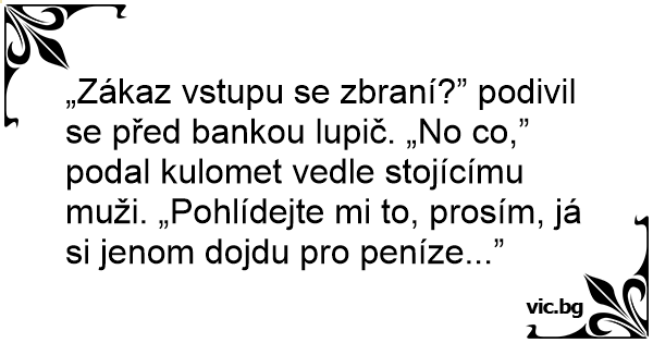 „Zákaz vstupu se zbraní?” podivil se před bankou lupič. „No co,” podal kulomet vedle stojícímu muži. „Pohlídejte mi to, prosím, já si jenom dojdu pro peníze...”