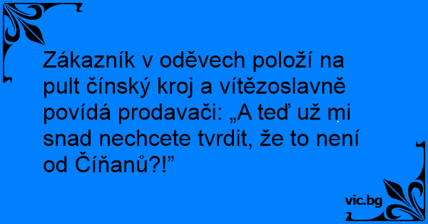 Zákazník v oděvech položí na pult čínský kroj a vítězoslavně povídá prodavači: „A teď už mi snad nechcete tvrdit, že to není od Číňanů?!”
