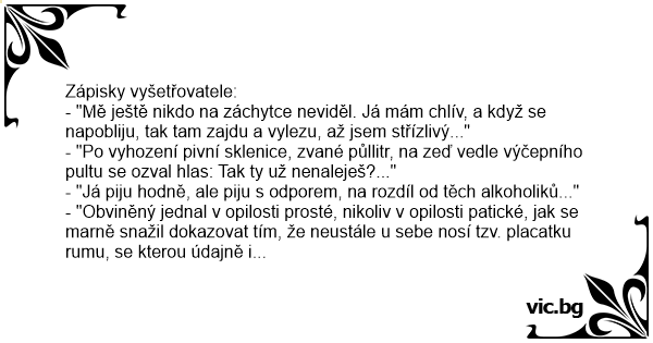 - "Obviněný jednal v opilosti prosté, nikoliv v opilosti patické, jak se marně snažil dokazovat tím, že neustále u sebe nosí tzv. placatku rumu, se kterou údajně i spí..."