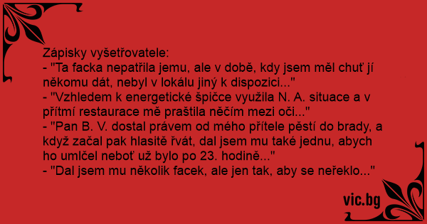 - "Pan B. V. dostal právem od mého přítele pěstí do brady, a když začal pak hlasitě řvát, dal jsem mu také jednu, abych hо umlčel neboť už bylo po 23. hodině..."