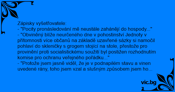 - "Obviněný blíže neurčeného dne v pohostinství Jednoty v přítomnosti více občanů na základě uzavřené sázky si namočil pohlaví do skleničky s grogem stojící na stole, přestože pro provinění proti socialistickému soužití byl postižen rozhodnutím komise pro ochranu veřejného pořádku..."