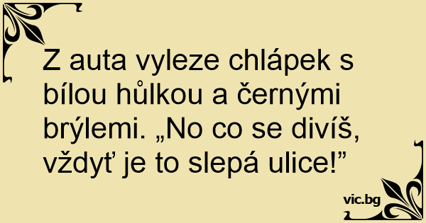 Z auta vyleze chlápek s bílou hůlkou a černými brýlemi. „No co se divíš, vždyť je to slepá ulice!”