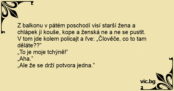 Z balkonu v pátém poschodí visí starší žena a chlápek jí kouše, kope a ženská ne a ne se pustit.