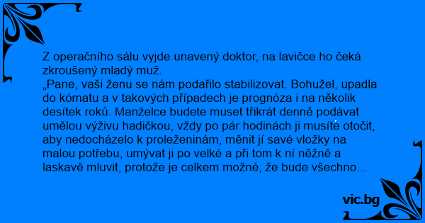 „Pane, vaši ženu se nám podařilo stabilizovat. Bohužel, upadla do kómatu a v takových případech je prognóza i na několik desítek roků. Manželce budete muset třikrát denně podávat umělou výživu hadičkou, vždy po pár hodinách ji musíte otočit, aby nedocházelo k proleženinám, měnit jí savé vložky na malou potřebu, umývat ji po velké a při tom k ní něžně a laskavě mluvit, protože je celkem možné, že bude všechno vnímat a slyšet. Po dvaceti letech se může stát, že se na chvilku probere, otevře oči, pozná vás, usměje se a znovu upadne do kómatu na dalších dvacet let.”