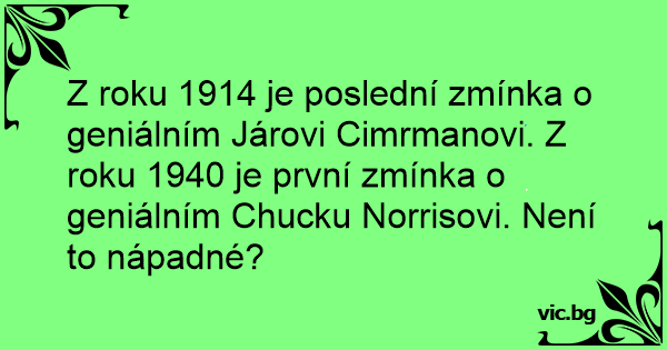 Z roku 1914 je poslední zmínka o geniálním Járovi Cimrmanovi. Z roku 1940 je první zmínka o geniálním Chucku Norrisovi. Není to nápadné?