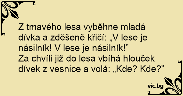 Z tmavého lesa vyběhne mladá dívka a zděšeně křičí: „V lese je násilník! V lese je násilník!”
