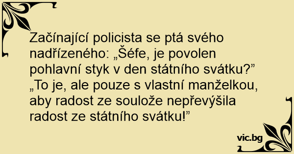 Začínající policista se ptá svého nadřízeného: „Šéfe, je povolen pohlavní styk v den státního svátku?”