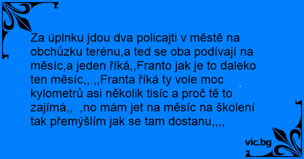 Za úplnku jdou dva policajti v městě na obchůzku terénu,a ted se oba podívají na měsíc,a jeden říká,,Franto jak je to daleko ten měsíc,, ,,Franta říká ty vole moc kylometrů asi několik tisíc a proč tě to zajímá,, ,no mám jet na měsíc na školení tak přemýšlím jak se tam dostanu,,,,