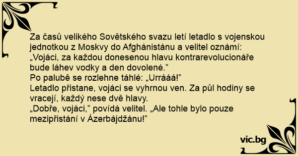 Za časů velikého Sovětského svazu letí letadlo s vojenskou jednotkou z Moskvy do Afghánistánu a velitel oznámí: „Vojáci, za každou donesenou hlavu kontrarevolucionáře bude láhev vodky a den dovolené.”