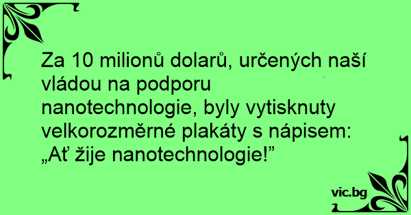 Za 10 milionů dolarů, určených naší vládou na podporu nanotechnologie, byly vytisknuty velkorozměrné plakáty s nápisem: „Ať žije nanotechnologie!”