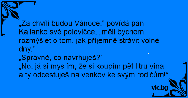 „Za chvíli budou Vánoce,” povídá pan Kalianko své polovičce, „měli bychom rozmýšlet o tom, jak příjemně strávit volné dny.”