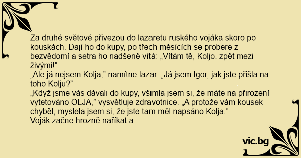 „Ale já nejsem Kolja,” namítne lazar. „Já jsem Igor, jak jste přišla na toho Kolju?”