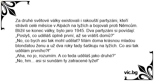 Za druhé světové války existovali i rakouští partyzáni, kteří strávili celé měsíce v Alpách na lyžích a bojovali proti Němcům. Blížil se konec války, bylo jaro 1945. Dva partyzáni si povídají: „Poslyš, co uděláš úplně první, až se vrátíš domů?”