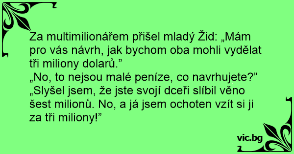 „Slyšel jsem, že jste svojí dceři slíbil věno šest milionů. No, a já jsem ochoten vzít si ji za tři miliony!”