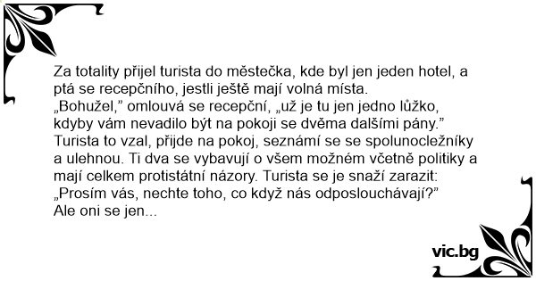 „Bohužel,” omlouvá se recepční, „už je tu jen jedno lůžko, kdyby vám nevadilo být na pokoji se dvěma dalšími pány.”