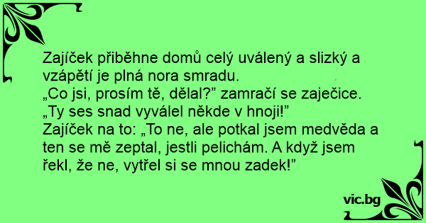 Zajíček na to: „To ne, ale potkal jsem medvěda a ten se mě zeptal, jestli pelichám. A když jsem řekl, že ne, vytřel si se mnou zadek!”