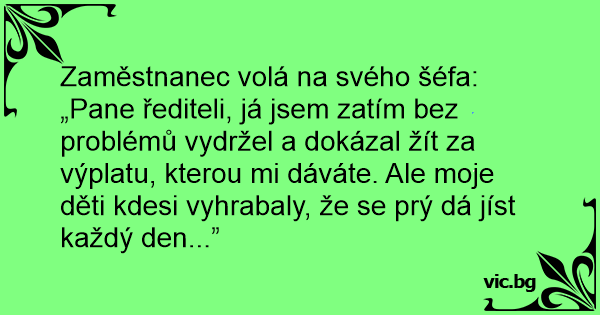 Zaměstnanec volá na svého šéfa: „Pane řediteli, já jsem zatím bez problémů vydržel a dokázal žít za výplatu, kterou mi dáváte. Ale moje děti kdesi vyhrabaly, že se prý dá jíst každý den...”