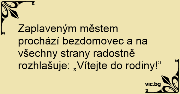 Zaplaveným městem prochází bezdomovec a na všechny strany radostně rozhlašuje: „Vítejte do rodiny!”