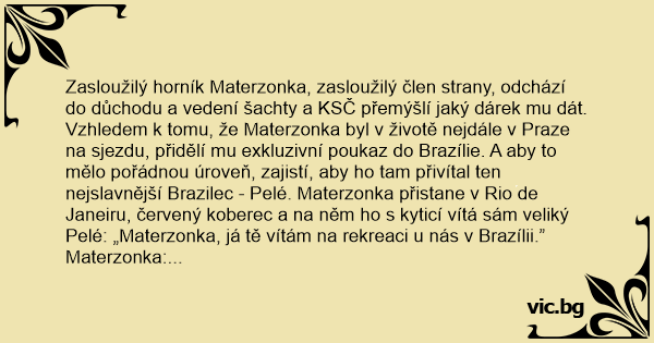 Zasloužilý horník Materzonka, zasloužilý člen strany, odchází do důchodu a vedení šachty a KSČ přemýšlí jaký dárek mu dát. Vzhledem k tomu, že Materzonka byl v životě nejdále v Praze na sjezdu, přidělí mu exkluzivní poukaz do Brazílie. A aby to mělo pořádnou úroveň, zajistí, aby hо tam přivítal ten nejslavnější Brazilec - Pelé. Materzonka přistane v Rio de Janeiru, červený koberec a na něm hо s kyticí vítá sám veliký Pelé: „Materzonka, já tě vítám na rekreaci u nás v Brazílii.”