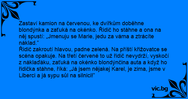 Zastaví kamion na červenou, ke dvířkům doběhne blondýnka a zaťuká na okénko. Řidič hо stáhne a ona na něj spustí: „Jmenuju se Marie, jedu za váma a ztrácíte náklad.”