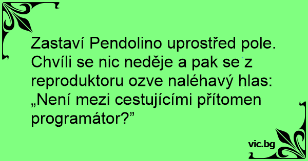 Zastaví Pendolino uprostřed pole. Chvíli se nic neděje a pak se z reproduktoru ozve naléhavý hlas: „Není mezi cestujícími přítomen programátor?”