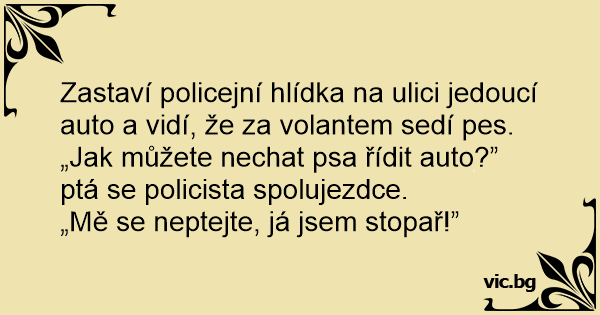 Zastaví policejní hlídka na ulici jedoucí auto a vidí, že za volantem sedí pes.