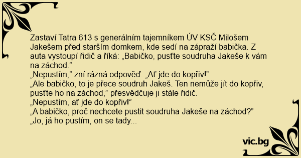 „Ale babičko, to je přece soudruh Jakeš. Ten nemůže jít do kopřiv, pusťte hо na záchod,” přesvědčuje ji stále řidič.